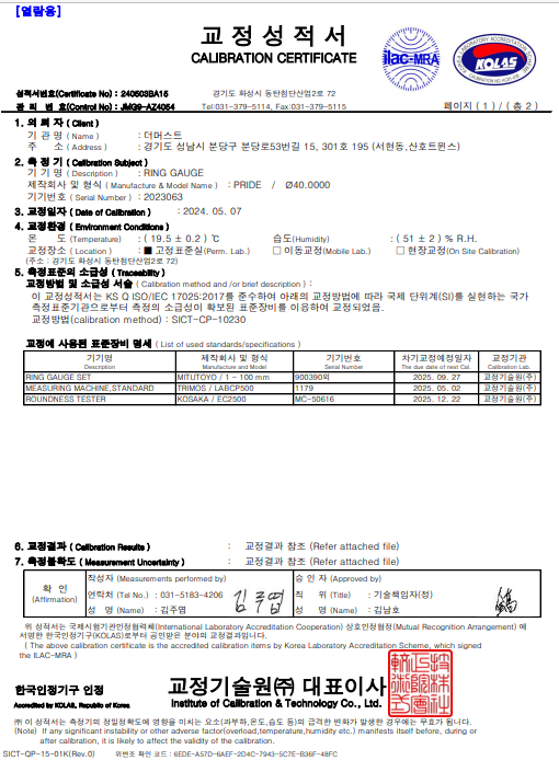 2024년 5월 7일자로 40.0 mm 링게이지의 국내 KOLAS교정 성적서 샘플을 이미지에 추가하였습니다.