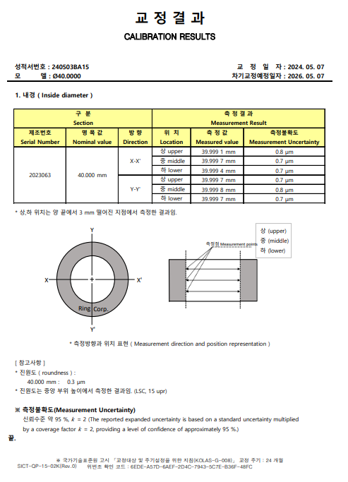 2024년 5월 7일자로 40.0 mm 링게이지의 국내 KOLAS교정 성적서 샘플을 이미지에 추가하였습니다.